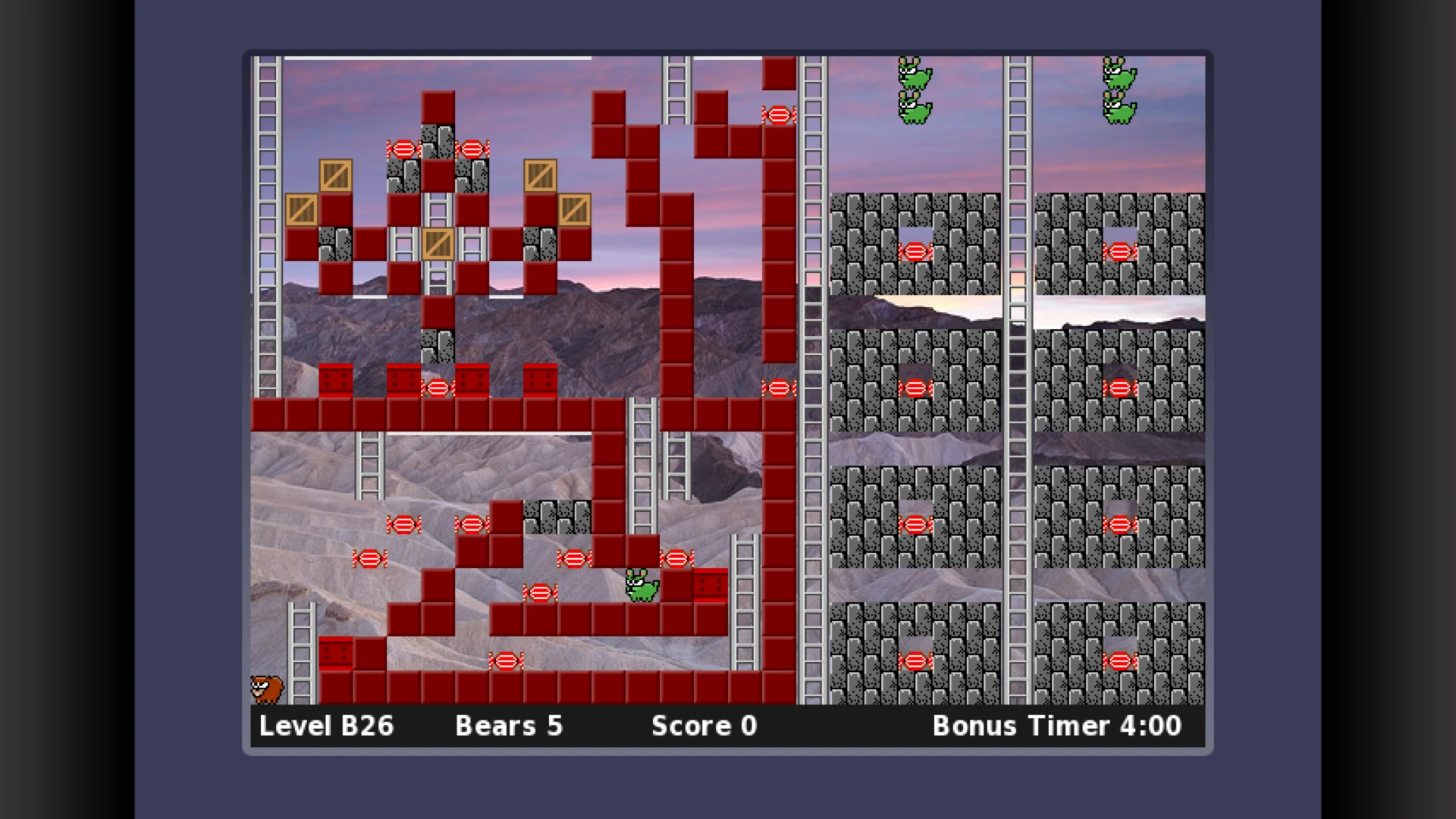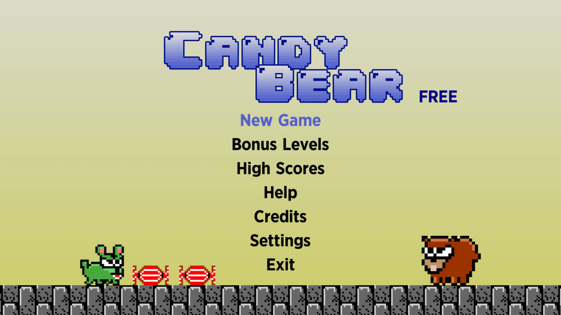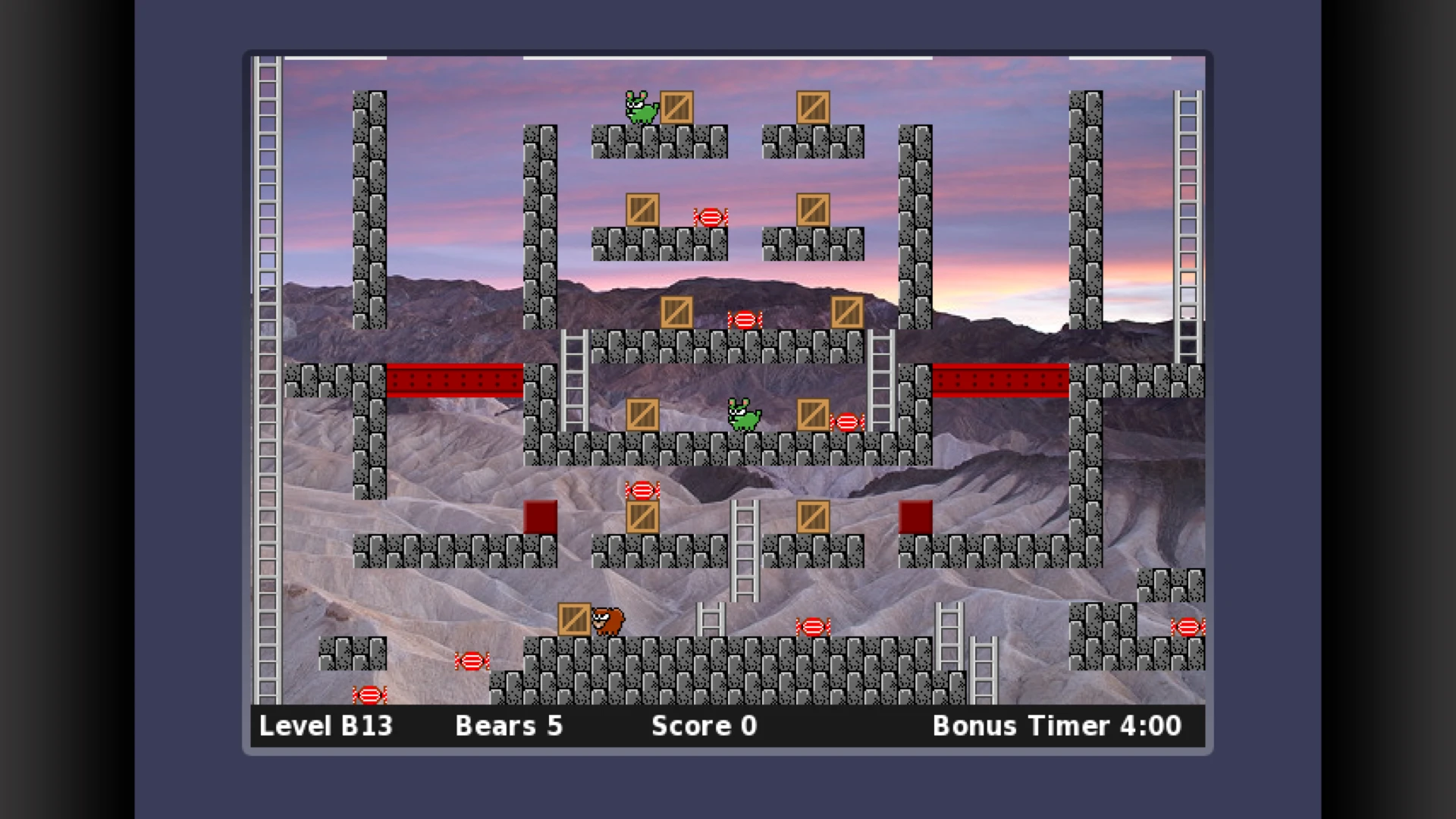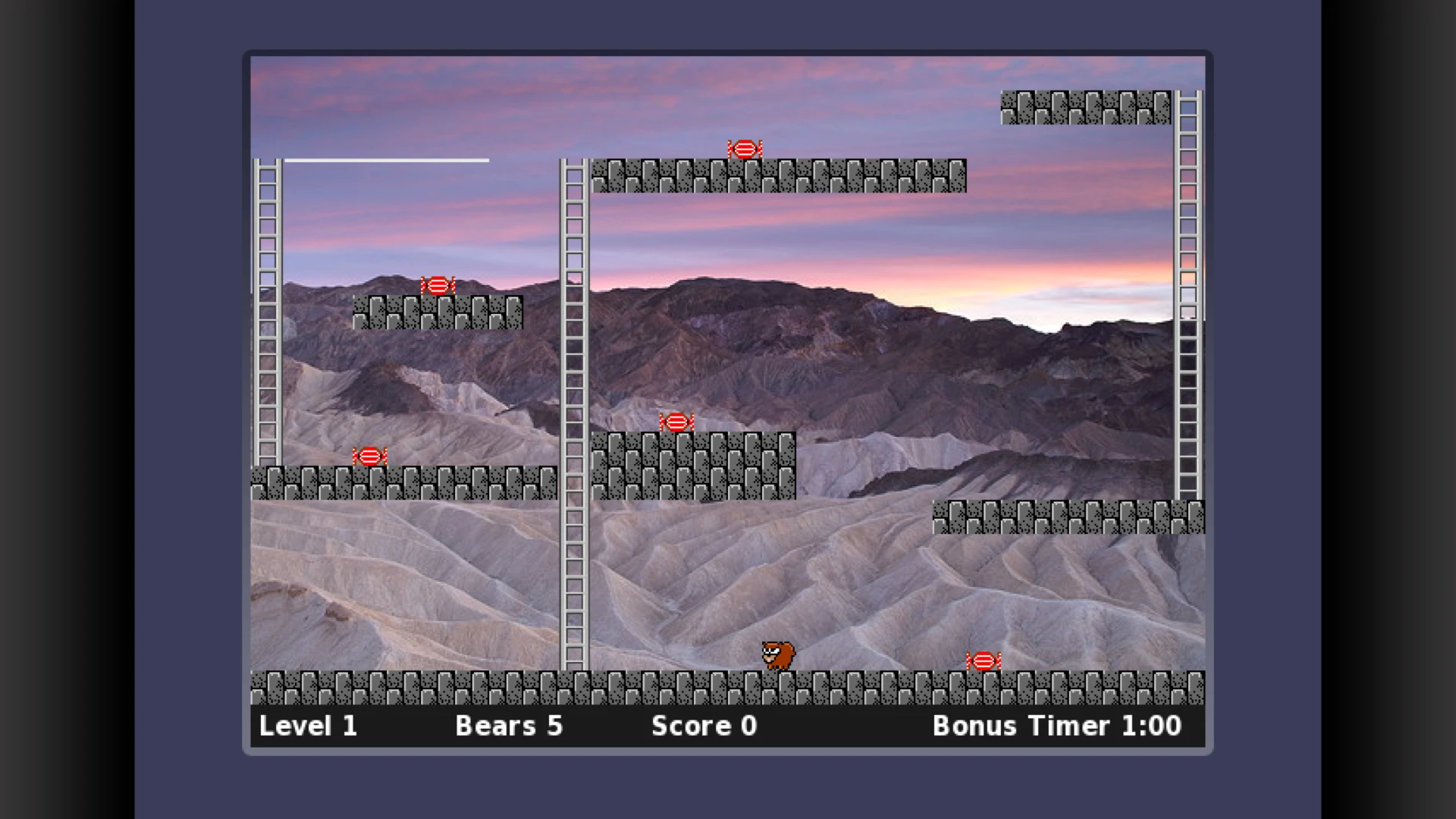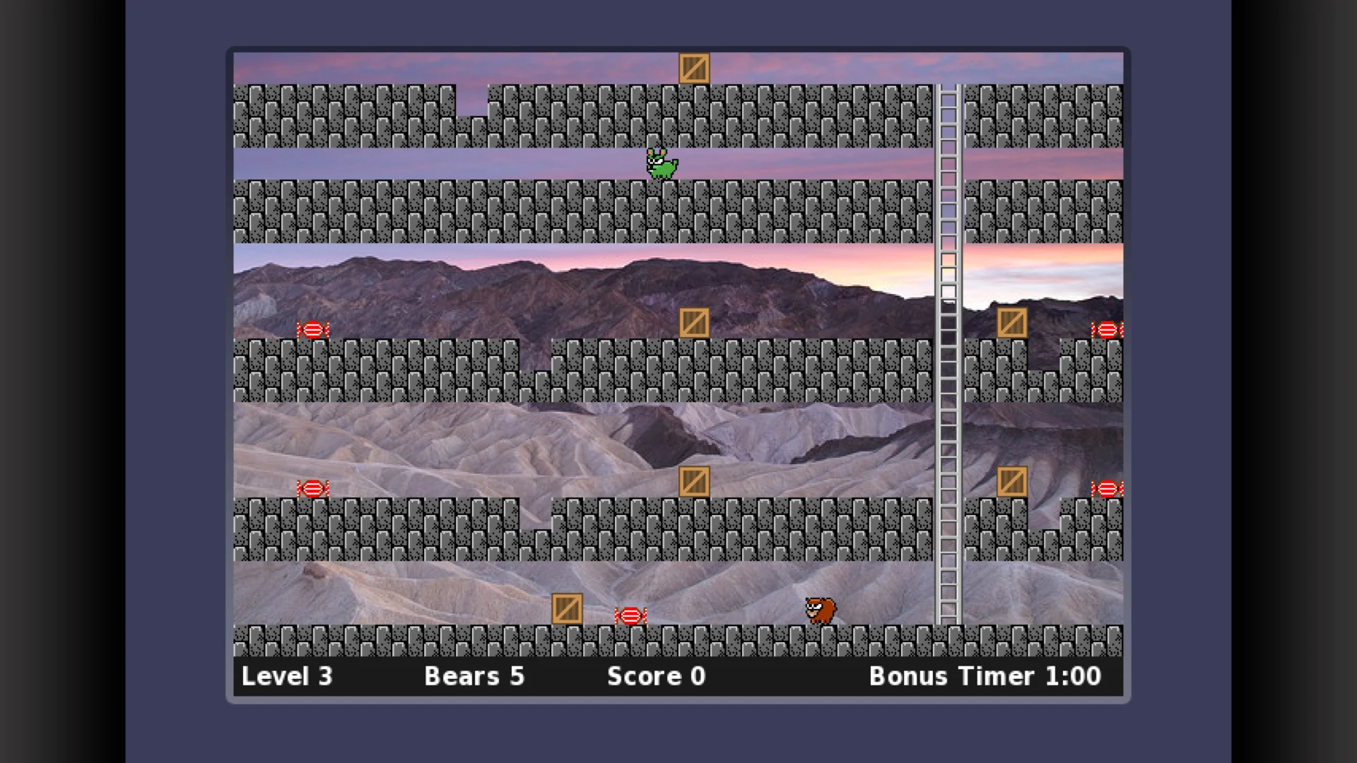 You are a bear, a bear dodging green bunnies and collecting delicious candy. You're running over bricks, climbing up ladders, traversing bars, floating on moving platforms, and pushing crates to reach that elusive next level.